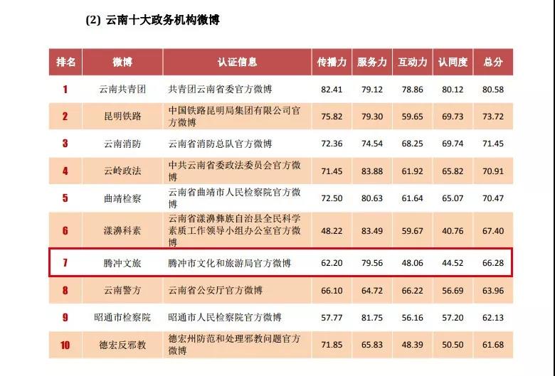 2019年全國(guó)政務(wù)微博影響力:騰沖文旅榮登“云南十大文旅系統(tǒng)微博”榜首