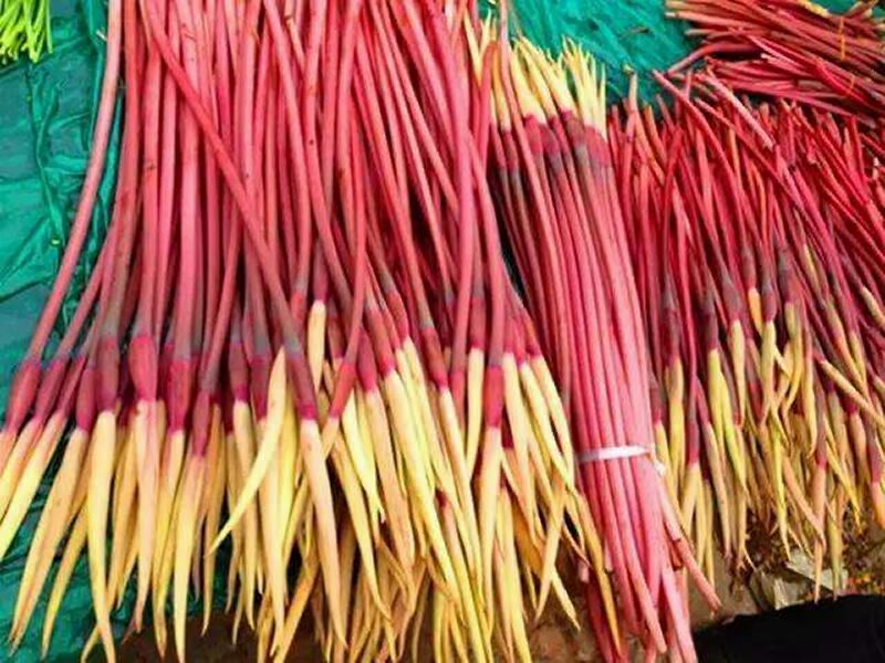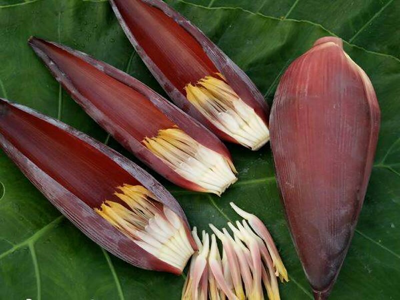 芭蕉花,芭蕉花食用前需要去除雄蕊,用沸水氽燙過涼水后,配以豬肉、姜、朝天椒、蔥炒勻即可食用。